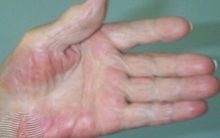 손은 간의 상태를 보여준다. 불그스레한 손바닥은 손바닥 홍반이라고도 불리는 증상으로 손바닥 가장자리에서부터 빨갛게 나타나고 점차 손가락 부위로 가까워진다. 일반적인 증상으로 손바닥이 너무 밝은 빨강색을 뛴다면 간 경변을 의심해 볼 수 있다. 간 질환이 있으면 호르몬 균형에 변화가 생기기 때문에 피부의 혈관이 확장돼 붉은 색을 띄게 된다. 손바닥이 붉어지는 원인은 손바닥 주변의 혈관 확장에 의한 것이지만 대부분이 간경화일 가능성이 있다고 한다.