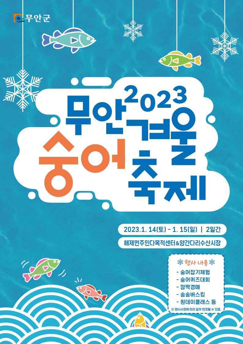 무안 숭어축제는 2023년 1월 14일부터 2023년 1월 15일까지 2일간 헤제주민다목적센터&양간다리시장에서 펼쳐진다. 행사내용에는 숭어잡기체험, 숭어퀴즈대회 ,깜짝경매, 숭숭버스킹, 원데이클래스 등이 있다. 무안의 5미 중 하나인 겨울철 도리포 숭어회는 자연산으로 유명하여 주말이면 광주 등 인근지역의 미식가들이 즐겨찾고 있다.
