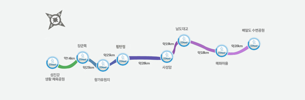 섬진강이 바다와 만나는 광양만의 배알도 해변을 출발하여 20㎞지나면 매화마을이, 18㎞를 달리면 남도대교가, 남도대교를 건너면 화개장터다. 화동포구 80리 길은 북동쪽으로 장대한 연봉이 흐르고 남서쪽으로는 경치의 규모가 웅장하다. 19㎞를 달리면 사성암이 나타나고 28㎞를 지나면 횡탄정, 25㎞지나면 향기유원지, 장군목, 섬진강 생활 체육공원이 나타난다.