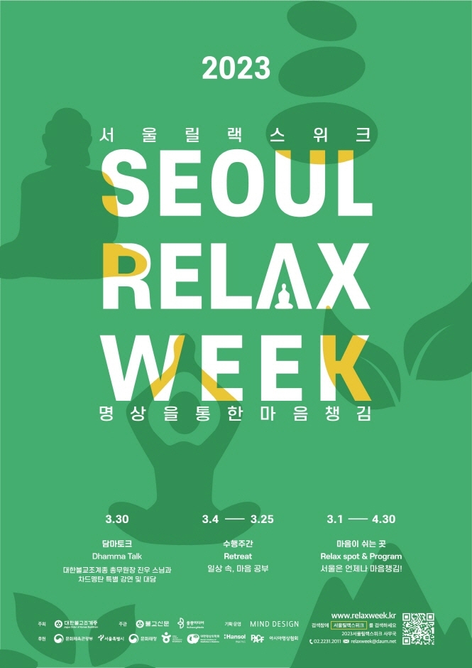 일상 속 소소하고 편안한 휴식을 제공하여 장기화된 펜데믹에 힘들고 지친 마음에 위로와 쉼표가 필요한 오늘 서울릴랙스위크에서 건강한 마음챙김 방법과 서울 도심 곳곳에 숨겨진 나만의 안식처를 찾아보자. 2023년 3월 30일 10시부터 12시 30분까지 세텍 컨벤션센터&줌웨비나 온.오프라인 동시 송출로 명상에 대한 대담 ,담마토크,