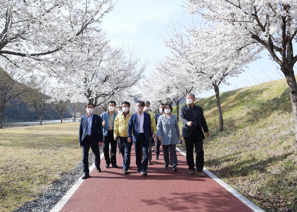 영천댐 벚꽃길을 가기 전 영천 도심 우로지 생태공원에 있는 벚꽃이 피어있다. 우로지 자연생태공원은 철마다 다른 수생식물오가 산책길 ,팔각정자, 관찰 데크 등이 어우러져 도심 속 자연을 만끽하기 좋은 곳이다. 영천댐 벚꽃백리길은 우로지에서 자동차로 약 30여분 가면 자리하고 있다. 영천댐하류공원 그리고 실향민들의 애환을다래주는 망향공원이 연결돼 있다.