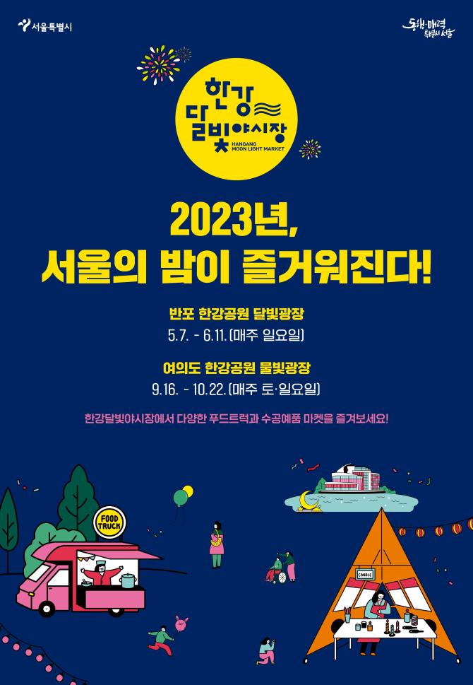 한강달빛야시장은 2023년 5월 7일부터 2023년 6월 11일까지 반포한강공원 달빛광장 일개에서 펼쳐진다. 국내 최고의 푸드트럭들이 선보이는 먹거리 ,수준 높은 수공예품, 당양한 공연까지 다양한 즐거움이 있는 서울형 야시장이다. 한강의 낭만적인 야경을 배경으로 문화와 예술, 식도락을 즐길 수 있어 먹거리를 함께 즐기며 다양한 공연을 감상할 수 있다.