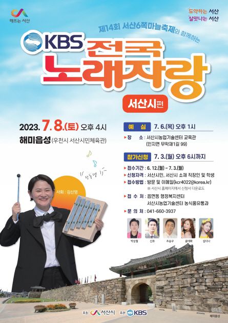 전국노래자랑 서산시편이 2023년 7월 8일 제 14회 서산 6쪽 마늘 축제와 함께 해미읍성에서 열린다. 우천시에는 서산시민체육관에서 개최되며, 예심은 7뤟 6일 오후 1시에 서산시농업기술센터 교육관에서 진행된다. 참가신청은 7월 3일 오후 6시까지 읍면동 행정복지센터와 서산시농업기술센터 농식품유통과, 시청 누리집에서 전자메일로 접수할 수 있다.