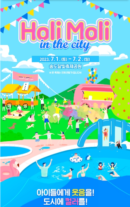 홀리몰리 키즈 페스티벌은 2023년 7월 1일부터 2023년 7월 2일까지 송도달빛축제공원에서 어린이들을 위한 컬러축제로 펼쳐진다. '아이들에게 웃음을! 도시에 컬러를!'을 죽제로 인도의 홀리축제를 모티브로 탄행하였다. 우리 아이들에게 '평범한 일상 속 잊지 못할 하루'가 될 것이다. 소중한 추억을 쌓아 가도록 하자. 홀리존, 워터바운스존, 피크닉존, 푸드존이 있다.