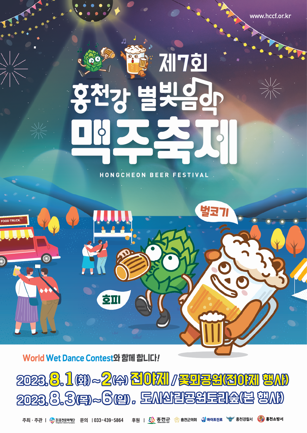 홍천강별빛음악맥주축제는 2023년 8월 1일부터 2023년 8월 2일까지 전야제를 꽃뫼공원에서 진행하며, 본행사는 2023년 8월 3일부터 2023년 8월 6일까지 도시산림공원 토리숲에서 펼쳐진다. 이용시간은 오후 5시부터 오수 10시까지이다. 메인존에는 메인무대와 홍천특산물 안주, 홍천수제맥주존, 테라존, 청년존, 별빛터널, 세계맥주존, 클링존, 만취쉼터 등이 있다.