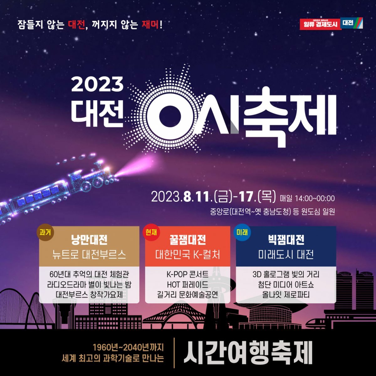 대전 0시 축제는 2023년 8월 11일부터 2023년 8월 17일까지 대전 중구 중앙로 일원의 대전역에서부터 옛 충남도청까지 에서 펼쳐진다. 대전 0시 축제는 잘 있거라 나는 간다~ 대전발 0시 50분~이라는 추억의 대중가요 대전 부르스를 모티브로 한 축제이다. 대전이 가진 모든 재미를 꺼지지 않게 지속시킨다는 의미의 잠들지 않은 대전, 꺼지지 않는 재미로 진행된다.