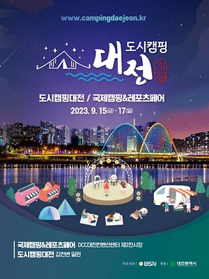 도시캠핑대전은 2023년 9월 15일부터 2023년 9월 17일까지 대전 갑천변 일원에서 펼쳐진다. 캠핑과 박람회, 공연이 어우러진 환상적인 축제로 전국의 캠핑족들을 모으고 있다. 대전 광역시가 후원하고 BSN이 주최하며 2박 3일간 대전시 갑천변 일원 및 DCC대전컨벤션센터 제2전시장에서 진행된다. 캠핑예약금 5만원, 박람회장 예약금 8천원 등은 상품권으로 교환