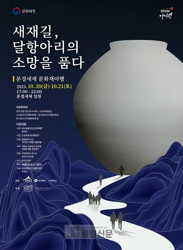 문경새재 문화재야행은 2023년 10월 20일 부터 2023년 10월 21일까지 문경새재도립공원, 분경세재 오픈 세트장에서 펼쳐진다. 문경새재 문화재야행은 조선시대 옛길과 문경의 문화유산을 그대로 간직한 문경새재도립공원 일원에서 진행하는 문화유산 야간 향유 프로그램이다. '새재길, 달항아리의 소망을 품다'를 주제로 한 문경새재 문화재 야행이 진행된다.