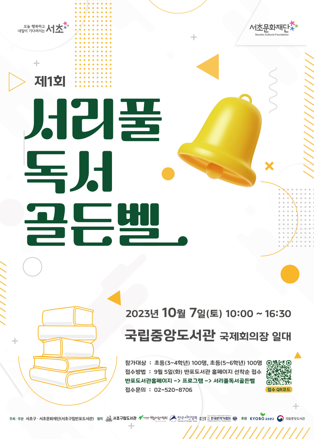 서리풀독서골든벨은 2023년 10월 7일 10시부터 16시까지 국립중앙도서관 국제회의장 일대에서 펼쳐진다, 서리풀독서골든벨이란 좋은 책을 친구들과 함께 도서관과 깊이 ,퀴즈를 통해 흥미롭게 읽어봄으로써 어린이들이 책읽는 즐거움을 느끼고 지혜를 함양하는 서초형 독서 퀴즈 캠프이다.
