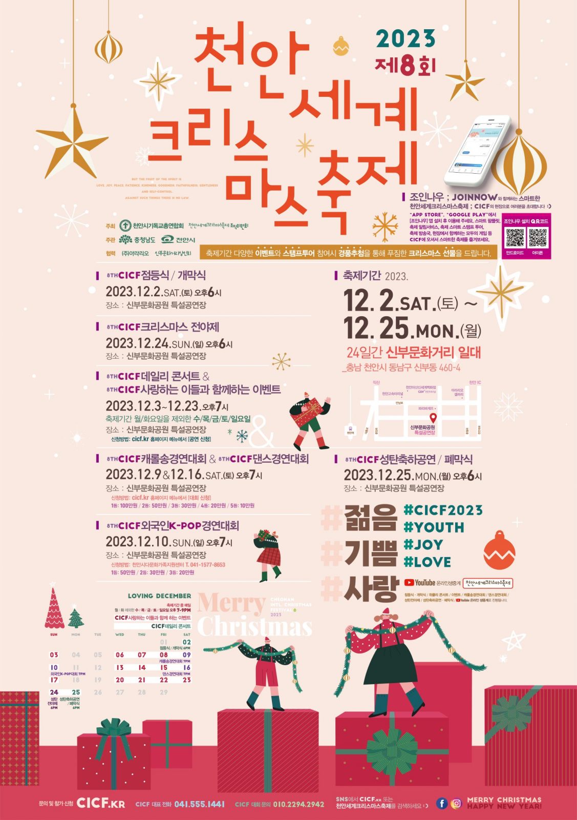 천안 세계크리스마스 축제는 2023 제8회로 2023년 12월 2일부터 2023년 12월 25일까지 24일간 신부문화거리 일대에서 펼쳐진다. 축제기간 다양한 이벤트와 스탬프투어 참여시 경품추첨을 통해 푸진한 크리스마스 선물을 드린다. "젊음, 기쁨, 사랑"을 주제로 천안 세계크리스마스 축제를 즐겨보자.