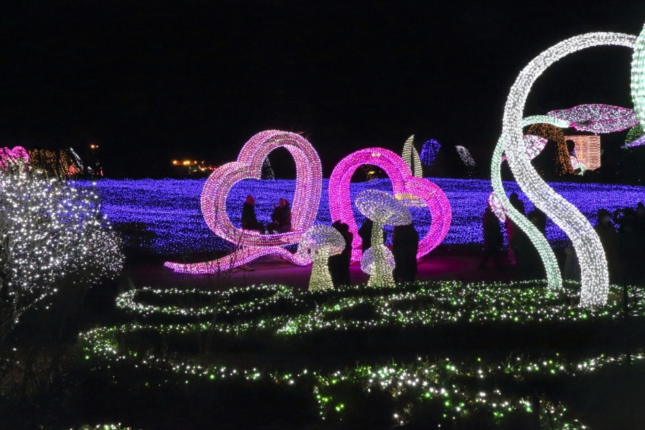 가평 아침고요수목원 오색별빛정원전은 겨울에 즐기는 아름다운 빛의 향연으로 긴 터널이 있고, 핑크비치 터널에서는 연인들의 웃음이 피어난다. 곰돌이와 버섯, 온갖 동물들과 루돌프 사슴이 있고 천사와 어우러진 하얀 교회를 배경삼아 추억을 다듬고 있다. 황금빛 마차가 서 있으며 암흑 속 은하수가 늘어서 있다. 하경정원의 전망대에서 펼쳐진 장관을 바라보자.