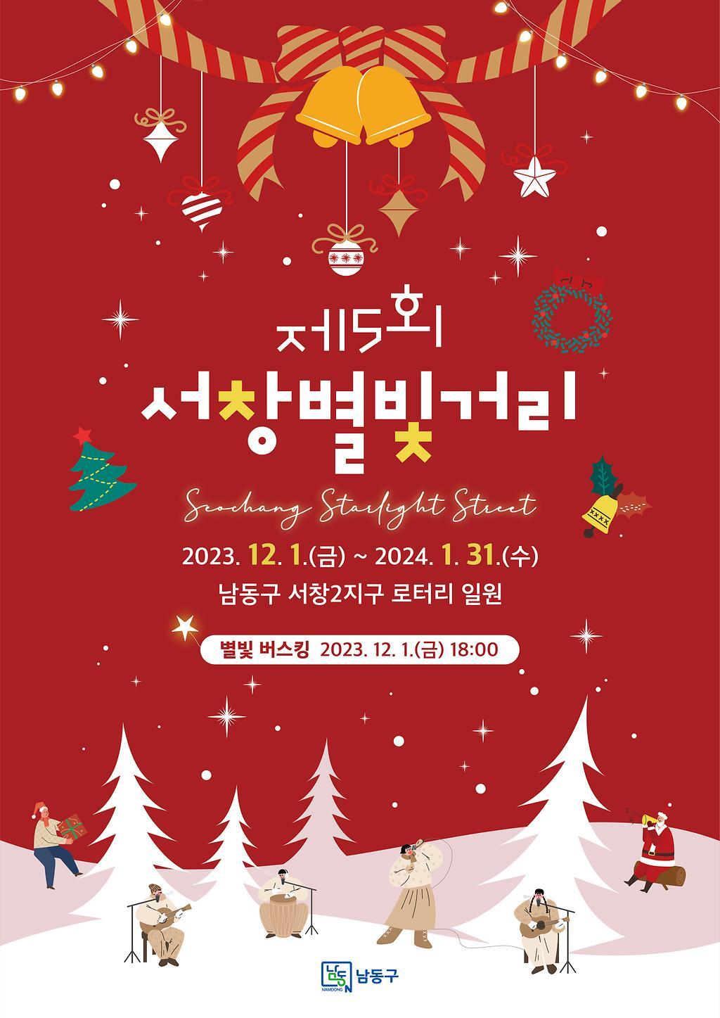서창별빛거리는 2023년 12월 1일부터 2024년 1월 31일까지 서창2지구 회전교차로 일원에서 펼쳐진다. 2019년부터 시작하여 2023년 올해 제 5회를 맞이하는 지역특화 관광축제이다. 서창 2지구 회전교차로 일원에 겨울과 크리스마스에 어울리는 별빛거리를 조성하여 지역주민과 관광객들에게 볼거리를 선사하고 연말연시에 따뜻한 위로와 희망을 전하고 있다.