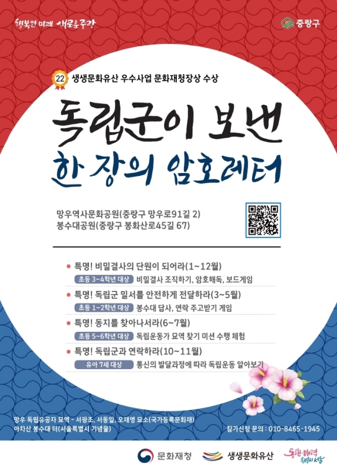 생생문화유산 중랑구 체험학습은 2024년 1월 3일부터 2024년 12월 7일까지 중랑구 망우로 91길 2 망우역사문화공원, 중랑구 봉화산로 45길 67 봉수대공원에서 펼쳐진다. 일제강점기 독립군이 사용하였던 각종 통신체계와 암호를 접목한 체험형 답사 프로그램이 마련된다. 독립군이 보낸 한자의 암호레터는 다음 4가지가 있다.