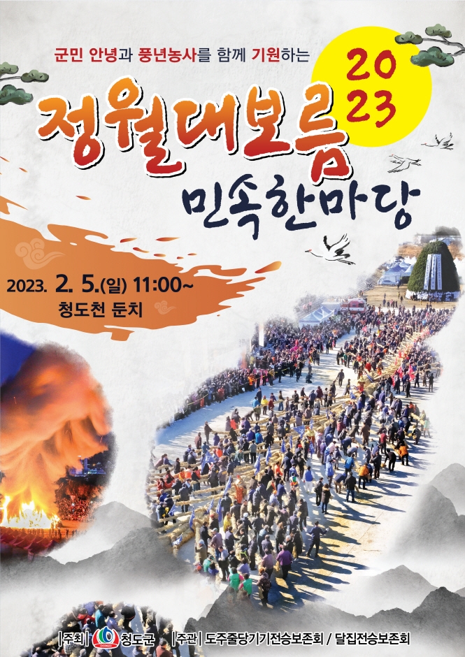 매년 이 고장의 화평과 안녕을 기원하는 달집태우기 행사가 청도천 둔치에서 재현되는데 휘영청 보름달밤을 수놓는 힘찬 불기둥은 청도인의 기상이요 ,풍년농사와 청소년의 꿈과 희망을 키우는 쥐불놀이 ,불꽃놀이가 이어지며 모닥불에 콩을 볶아 서로 나누어 먹으면서 정을나눈다. 민속연날리기 대회, 제기차기 ,투호, 널뛰기, 윷놀이, 세시음식 나누기 등이 열린다.