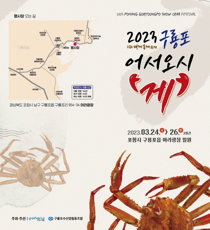 구룡포어서오시게는 지난 2023년에는 3월 24일부터 3월 26일까지 아라광장에서 4년만에 개최되었다. 2019년 제 1회 축제를 하고 난뒤 코로나 19로 길고도 힘들었던 지난 4년을 딛고 일어서는 기지개를 폈다고 한다. 동해안 최대 수산물 생산도시 포항의 대표 특산물인 구룡포 대게와 붉은대게를 각종 드라마 촬영지로도 유명한 구룡포에서 펼쳐지는 봄먹거리축제다.