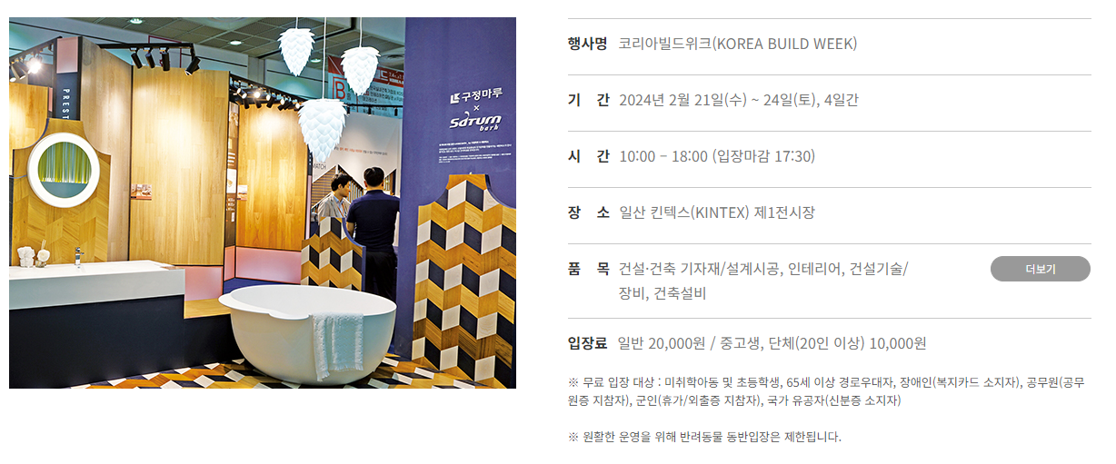 2024 코리아빌드위크는 초대형 건설, 건축, 셀프 인테리어 디자인 등 건축과 관련한 전문 전시회로 2024년 2월 21일부터 2024년 2월 24일까지 4일간 일산 킨텍스 제1전시장에서 펼쳐진다. 입장료는 일반 20,000원, 중고생 ,단체 20인 이상은 10,000원이며 사전등록과 미취학아동, 초등학생, 65세 이상, 장애인 공무원, 군인 국가유공자 등은 무료입장이 가능하다.