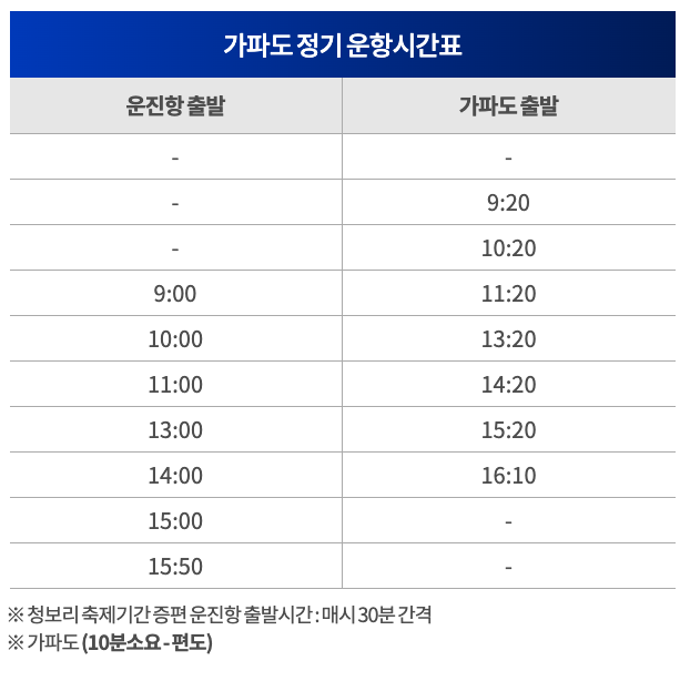 가파도 청보리축제는 2023년에는 4월 8일부터 16일까지 예정되었으며 2024년은 개화시기가 빨라져 4월 초순경에 대정읍 가파도 일원에서 펼쳐질 예정이다. 가파도 청보리의 품종맥향은 제주의 향토품종으로 봄이면 18만평의 청보리밭이 물결치는 가파도 청보리축제를 찾아보자. 축제기간에는 여객선을 미리 예약을 하여야 생각하고 있는 날짜에 맞추어 찾아갈 수 있다. 가파도까지 운행 시간은 편도로 10분 정도로 가까워서 배멀미약이 필요없는 거리이다. 모슬포 운진항에서 찾아간다. 가파도 배시간은 청보리축제 기간에는 증편으로 인해 매시 30분 간격으로 출발할 예정이다.