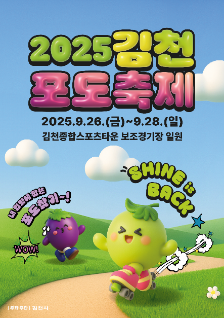 김천포도축제는 2025년 9월 26일부터 9월 28일가지 3일간 김천종합스포츠타운 보조경기장 일원에서 펼쳐진다. 기존의 틀을 벗어난 올해 김천포도축제는 어린이부터 중장년까지 다양하게 보고 즐길 수 있는 어린이 안전 놀이터, 어린이 뮤지컬, 추억 체험존, 포도의 달인, 샤인머스켓 네이처 팜 등 다양한 체험.참여 행사가 준비되어 있으며 눈과 귀를 즐겁게 해줄 박지현 ,왁스, 한혜진의 아름답고 달콤한 샤인 콘서트가 진행 될 예정으로 많이 달라졌으며 새로워 졌다.
