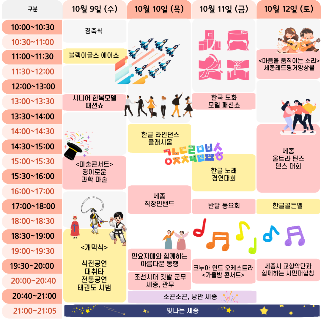 세종축제는 2024년 10월 9일부터 10월 12일까지 세종호수공원, 세종중앙공원 일원에서 펼쳐진다. 시민참여형 도시문화축제인 세종축제는 한글, 과학, 친환경 등 세종시 공간 정체성을 반영하여 기획한 축제이다. 블랙이글스 에어쇼, 한글놀이터 ,과학놀이터 등 시민들이 함께 기획하고 운영하는 프로그램으로 누구나 주인공이 되는 축제이다.