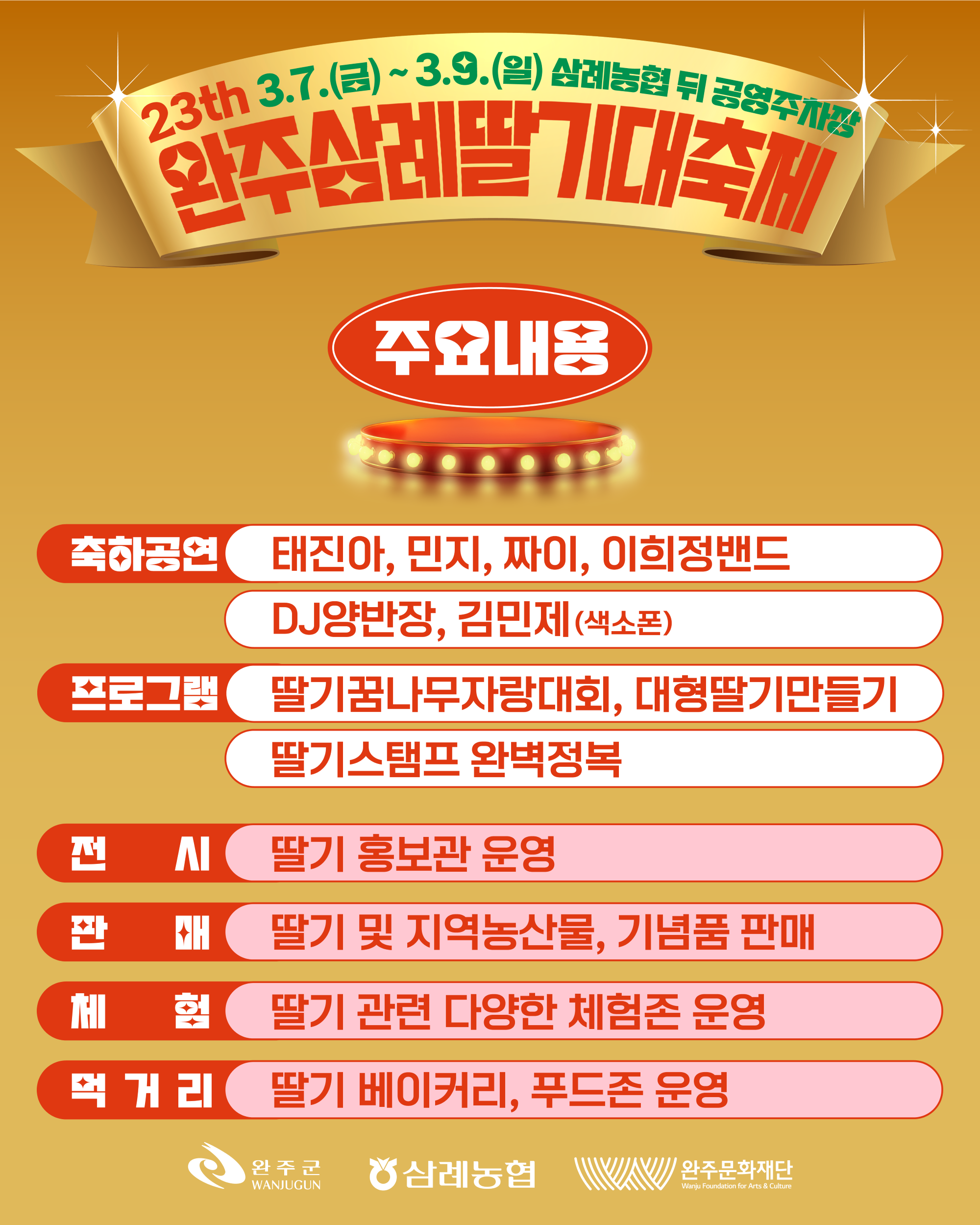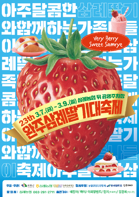 빨갛게 잘 익은 딸기와 함께하는 달콤한 봄날의 축제를 즐겨보자. 신선한 딸기의 싱그러움과 함께 맛과 즐거움이 3일간의 축제로 기다리고 있다. 개막식은 3월 8일 토요일 14시에 전북 완주군 삼례읍 동학로 42의 삼례농협 뒤 공영주차장에서 예정되어 있다.