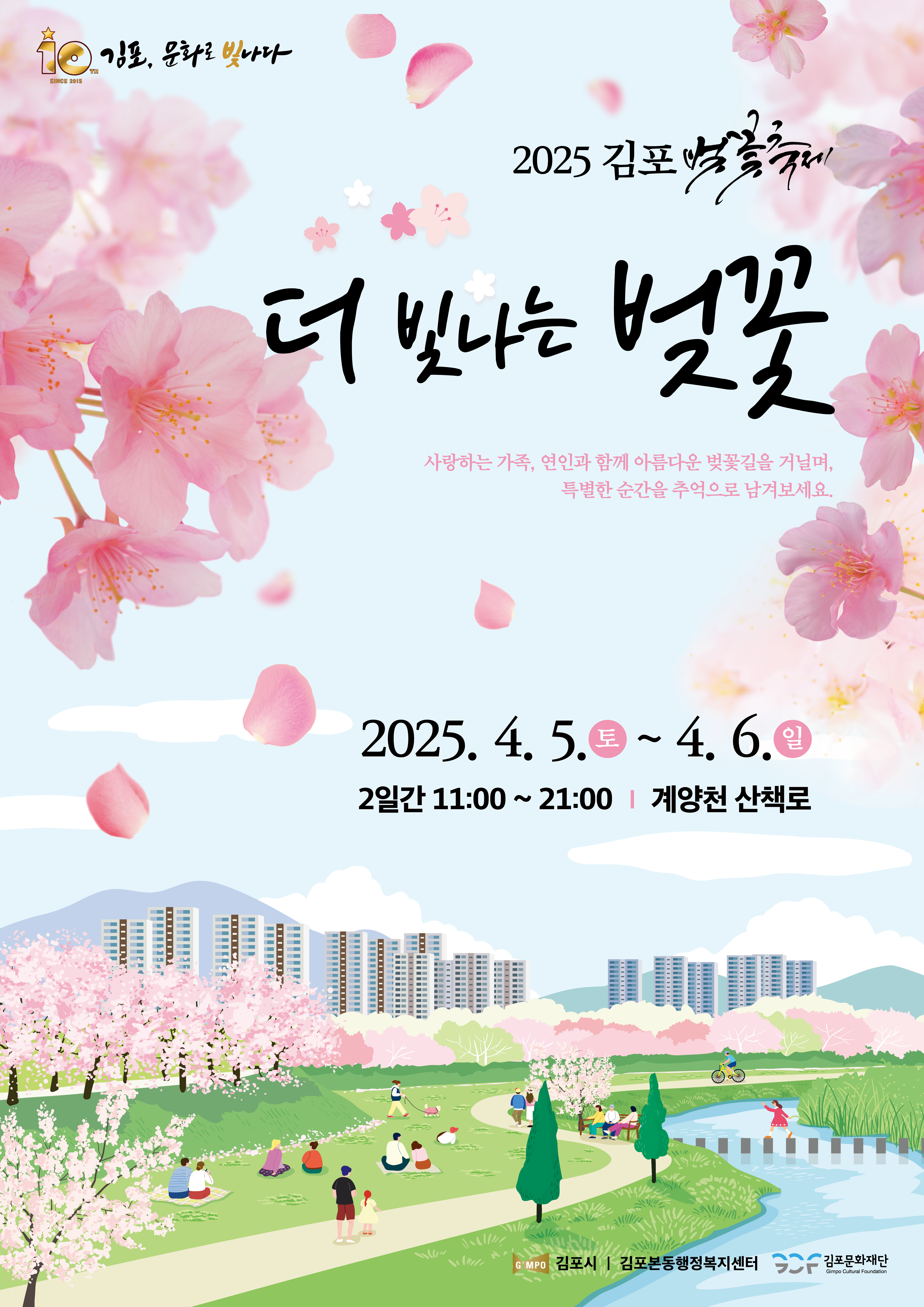 김포 벚꽃축제는 2025년 4월 5일부터 2025년 4울 일까지 경기도 김포시에서 펼쳐진다. 김포 벚꽃축제는 김포의 오롯이 벗꽃, 아름답고 감미로운 봄 페스티벌이다. 김표 대표 벚꽃 명소인 계양천 일원에서 개최하는 축제이다. 벚꽃 관람객 중심의 쉼이 있는 공간 조성 및 프로그램 구성으로 포토존 ,벚꽃 도서관, 쉼터 등 오롯이 벚꽃 풍경을 만끽하는 봄 페스티벌이 펼쳐진다.