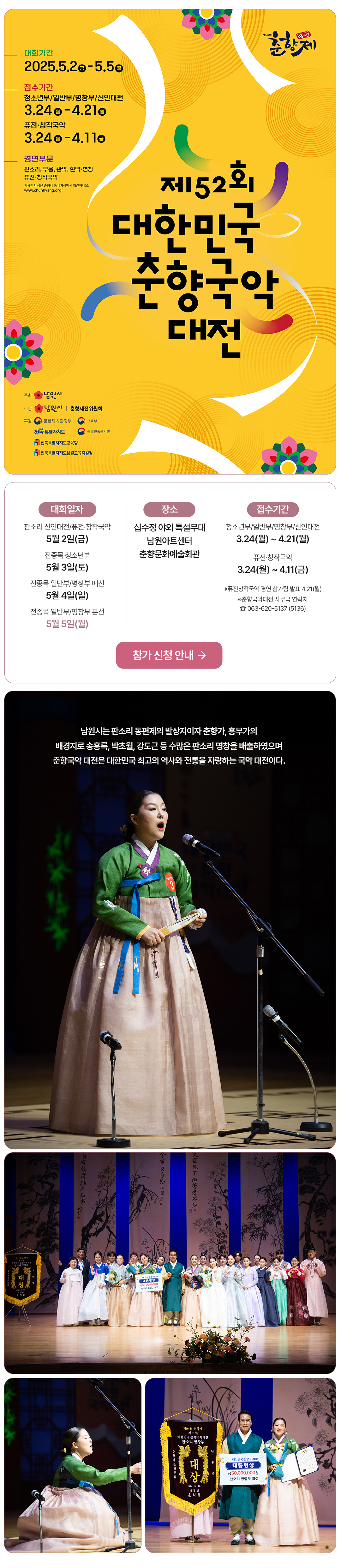 배52회 대한민국춘향국악대전은 판소리 신인대전, 퓨전, 창작국악 등으로 5월 2일, 전종목 청소년부는 5월 3일, 전종목 일반부/명창부 예선은 5월 4일, 전종복 일반부/명창부 본선은 5월 5일, 장소는 십수정 야외 특설무대 남원아트센터, 춘향문화예술회관 등,
