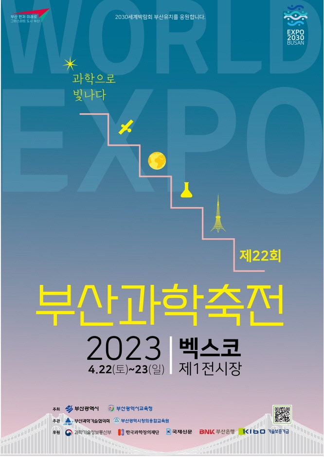 부산과학축전은 2023년 4월 22일부터 2023년 4월 23일까지 'Werld, 과학으로 빛나다' 를 주제로 벡스코 제1전시장에서 펼쳐진다. 2030세계박람회 유치를응원하며 시민들이 세계박람회 속 과학문화 프로그램으로 전시, 공연, 체험, 강연, 대회 등을 통해 생활 속에서 과학을 놀이로 즐기며 소통할 수 있는 '과학 한마당'잔치이자 '과학문화도시' 부산의 대표 과학축제다.